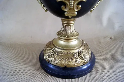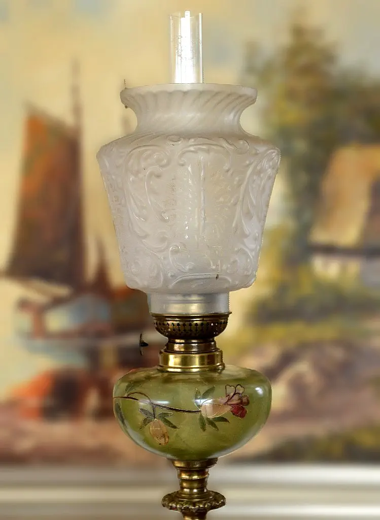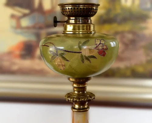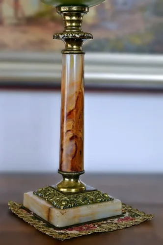 Francuska kolumnowa lampa naftowa z przełomu wieku. Podstawa oraz zwieńczenie marmurowej kolumny wykonane z mosiądzu. Szklany zbiorniczek na naftę ręcznie malowany w kwiaty. Mechanizm sygnowany na pokrętle.