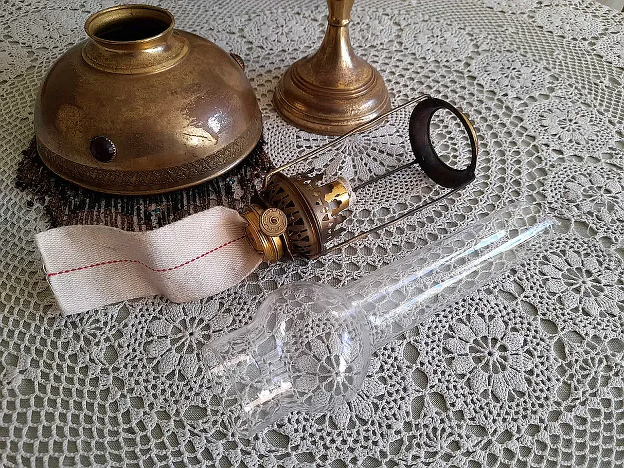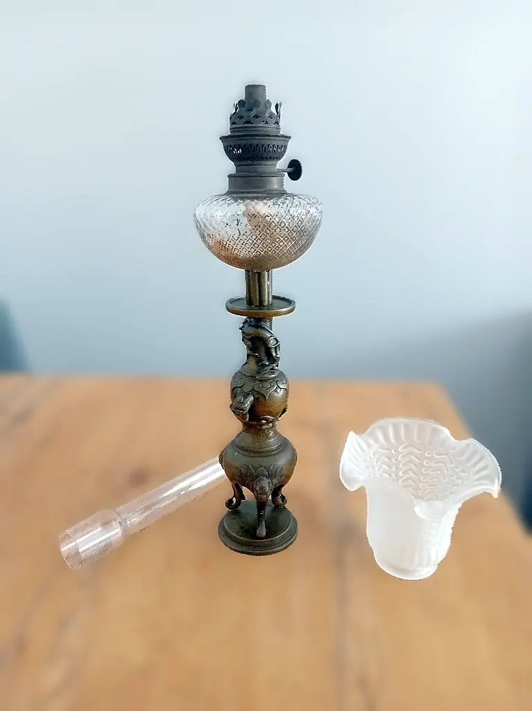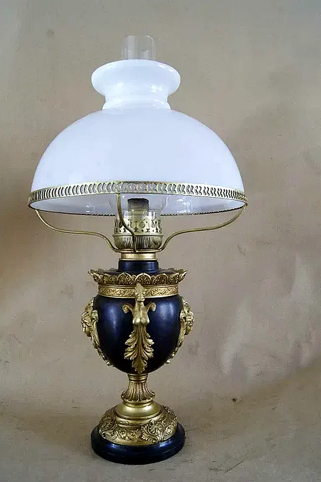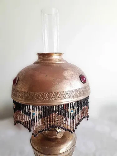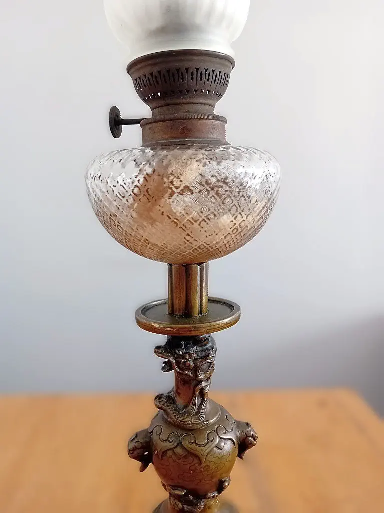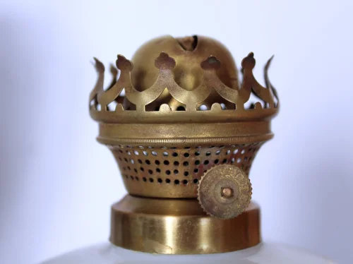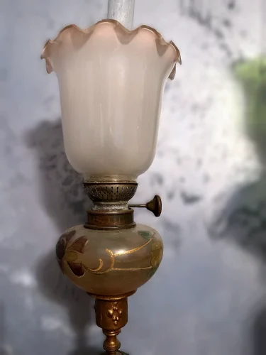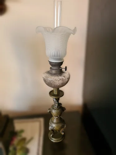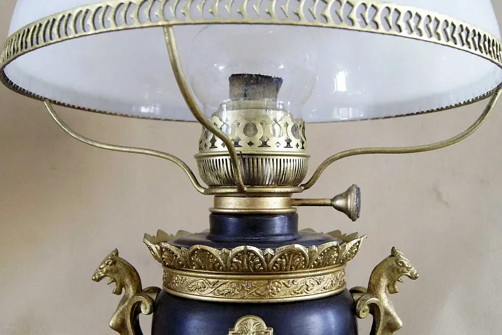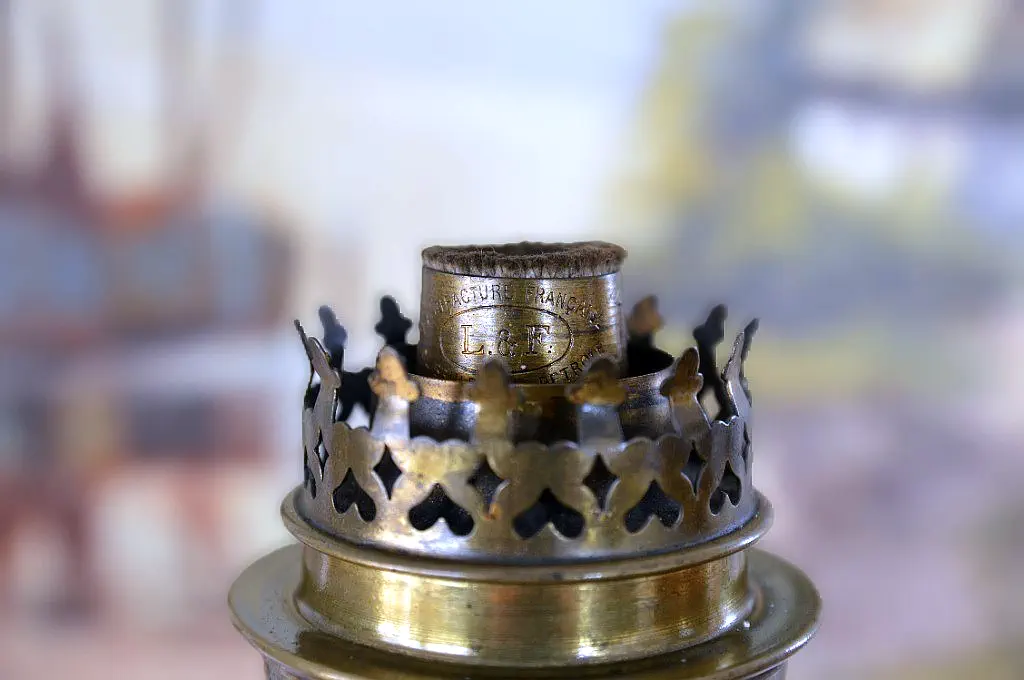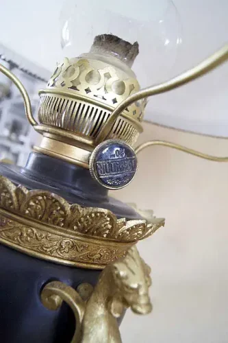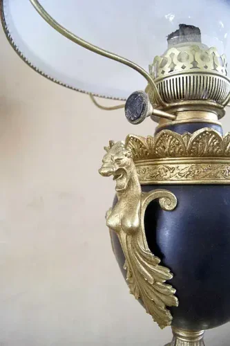 Francuska lampa naftowa "Paryżanka". Wykonana z mosiądzu.