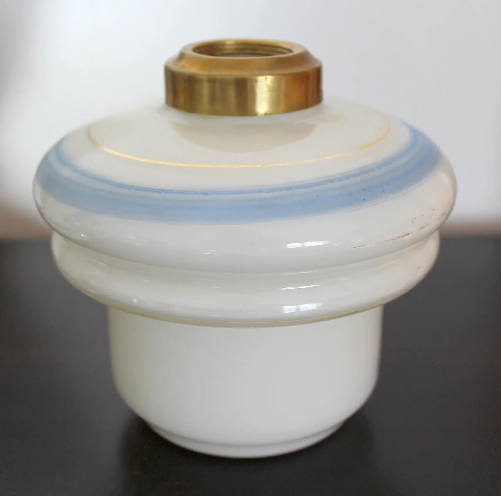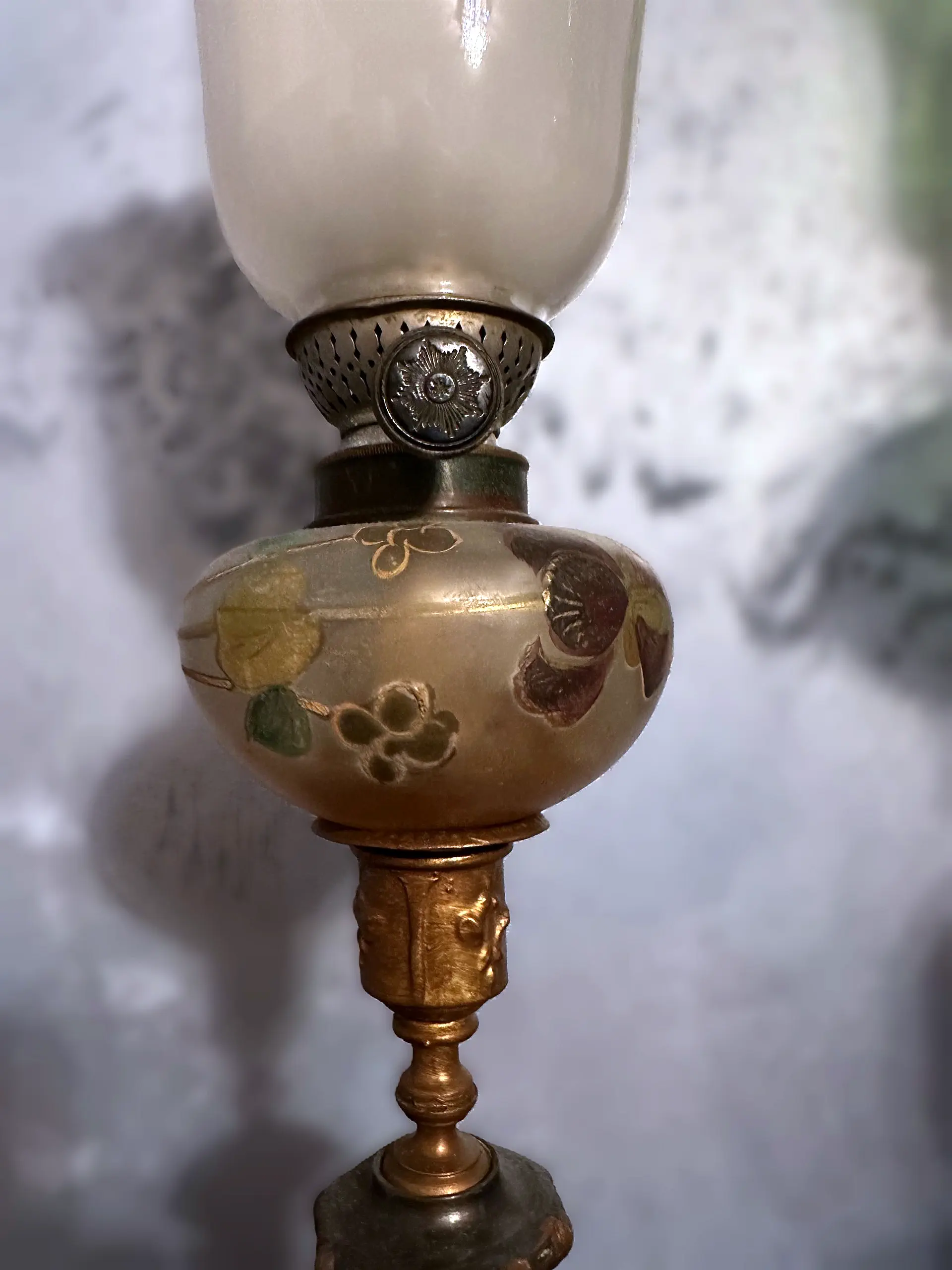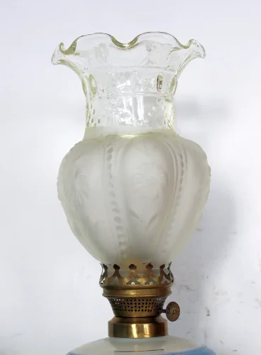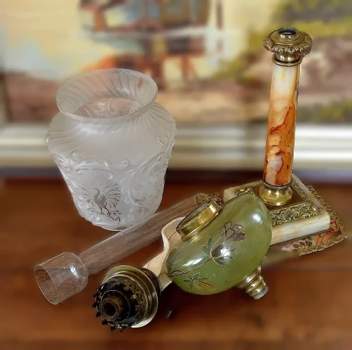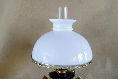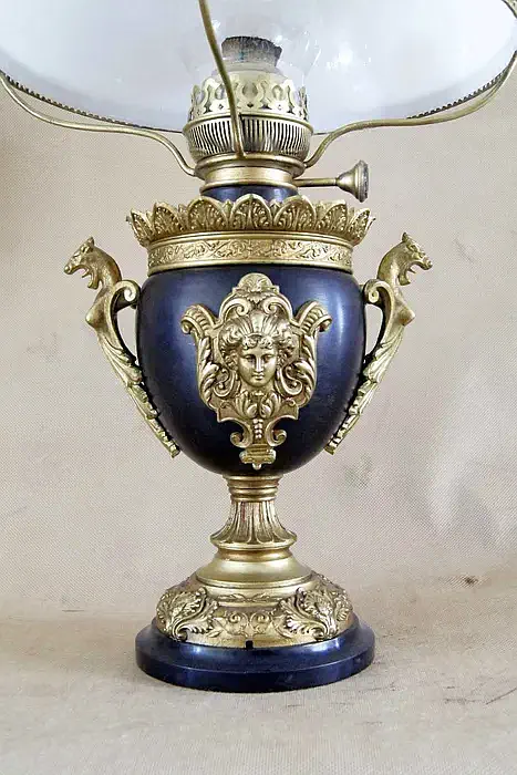 Lampa naftowa typu "Aladyn". Elementy metalowe wykonane z cynkalu, podstawa z marmuru. Klosz oryginalny, kominek sygnowany.