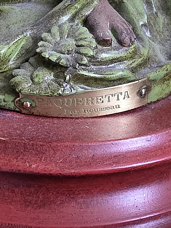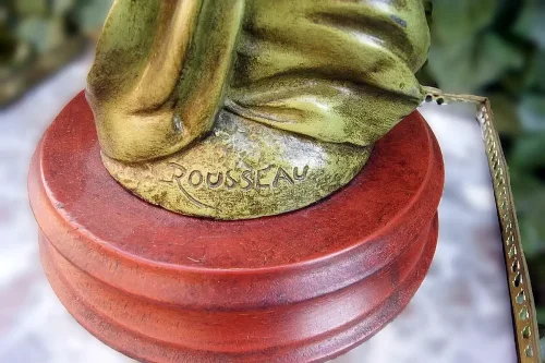 "Stokrotka" (Pâquerette) Figuralna sygnowana lampa naftowa z przełomu wieku. Wykonana z cynkalu, podstawa z drewna. Sygnatura Victor Rousseau (1865–1954).