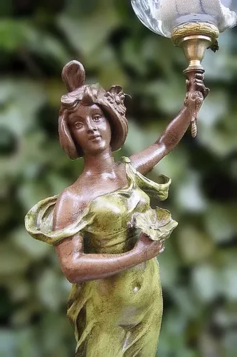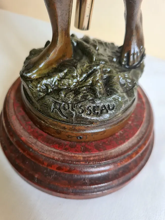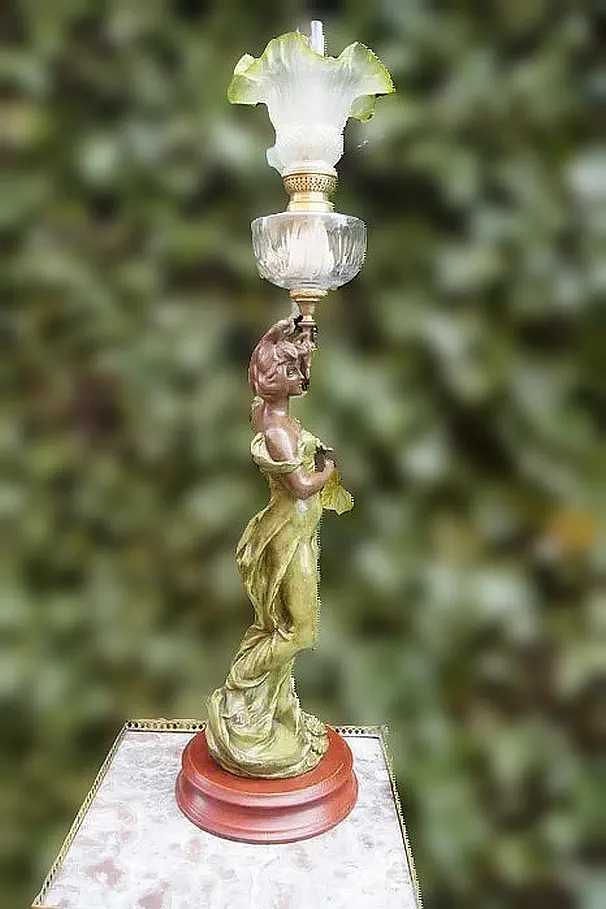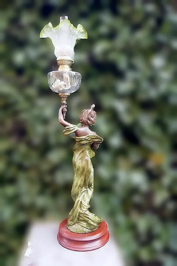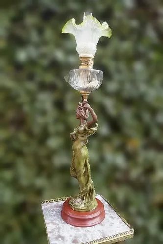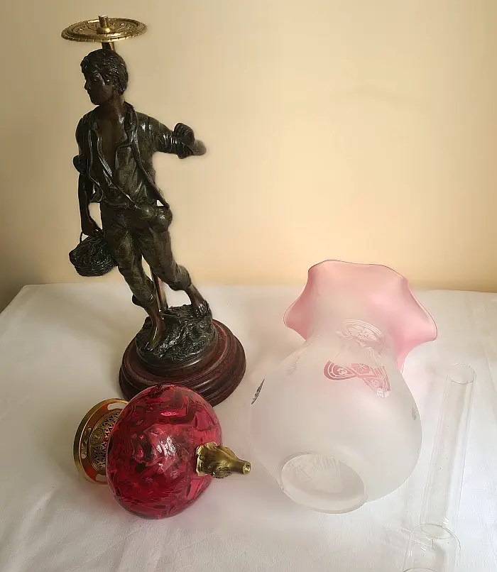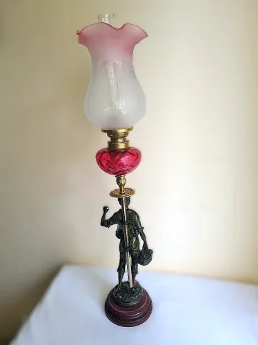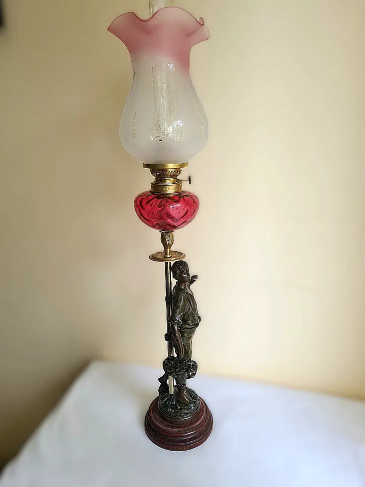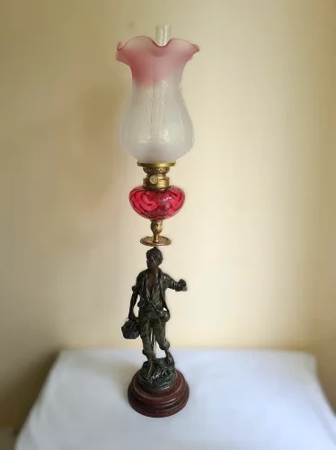 Figuralna lampa naftowa z przełomu wieku. Figura przedstawia mężczyznę powracającego z pól z koszem. Sygnowana Victor Rousseau (1865–1954).