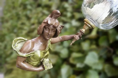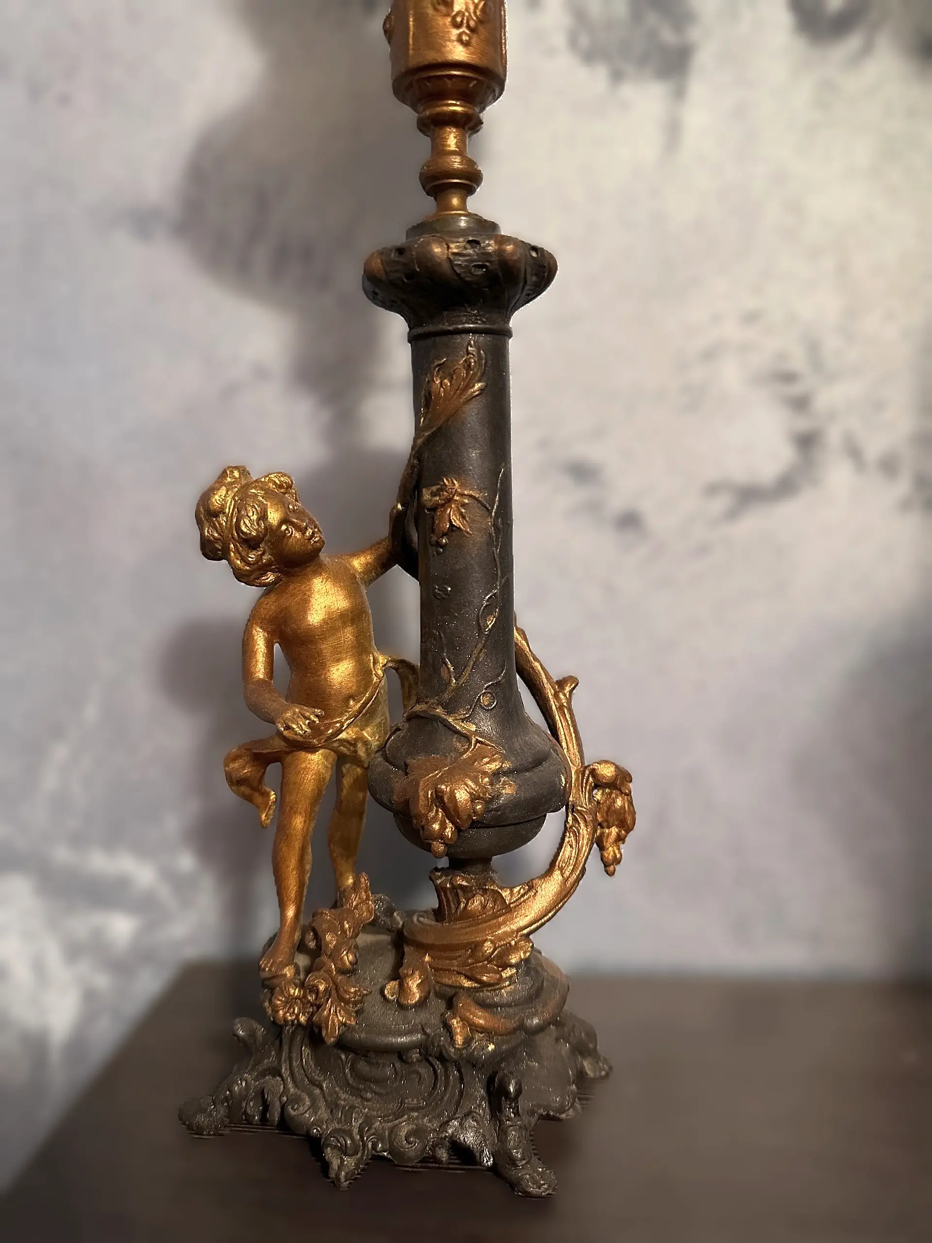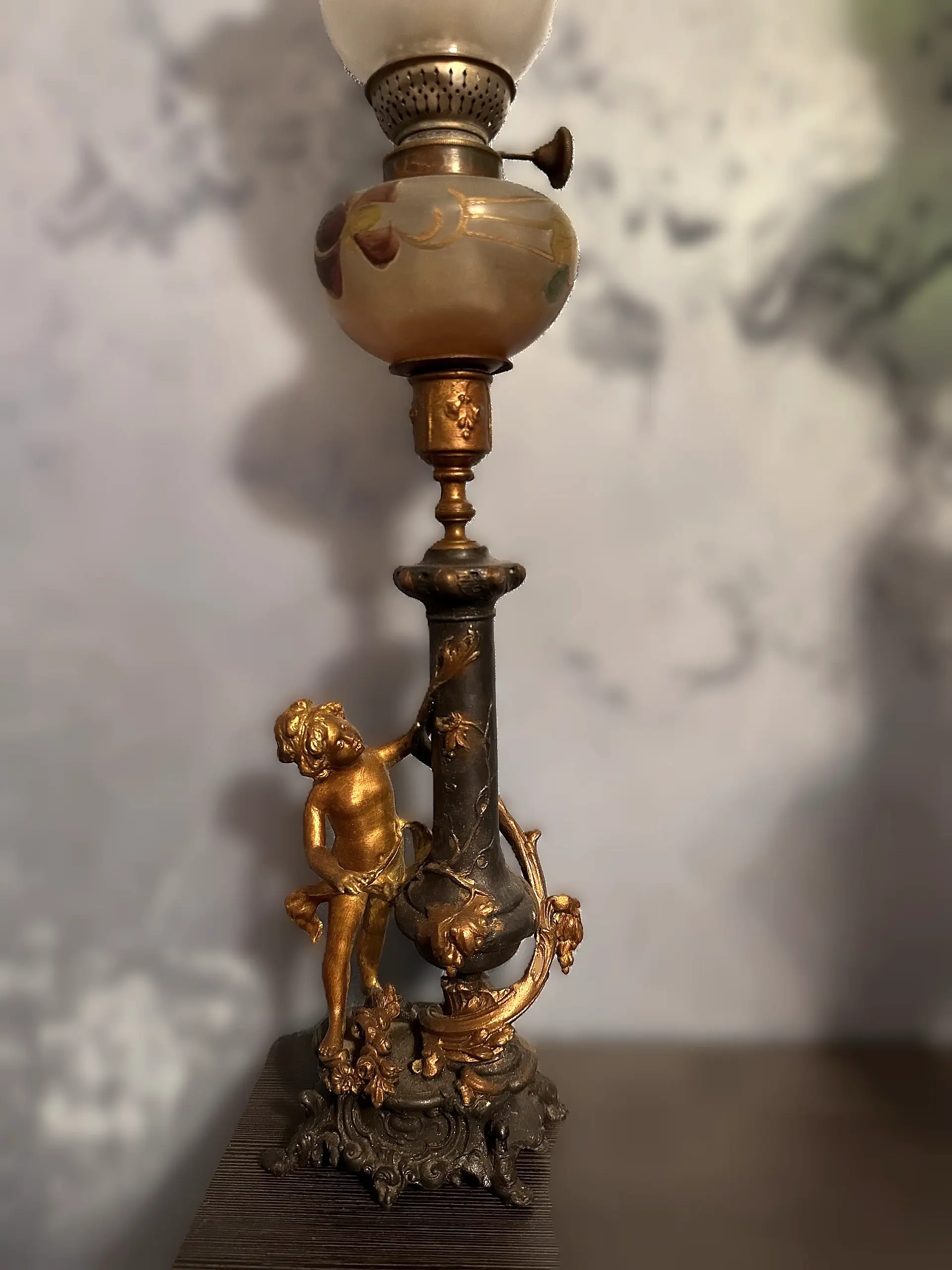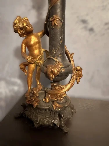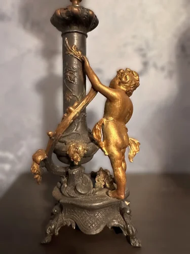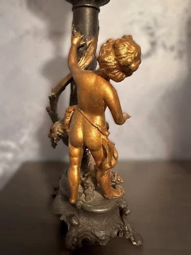 Francuska figuralna lampa naftowa "Amor". Wykonana z cynkalu.