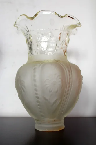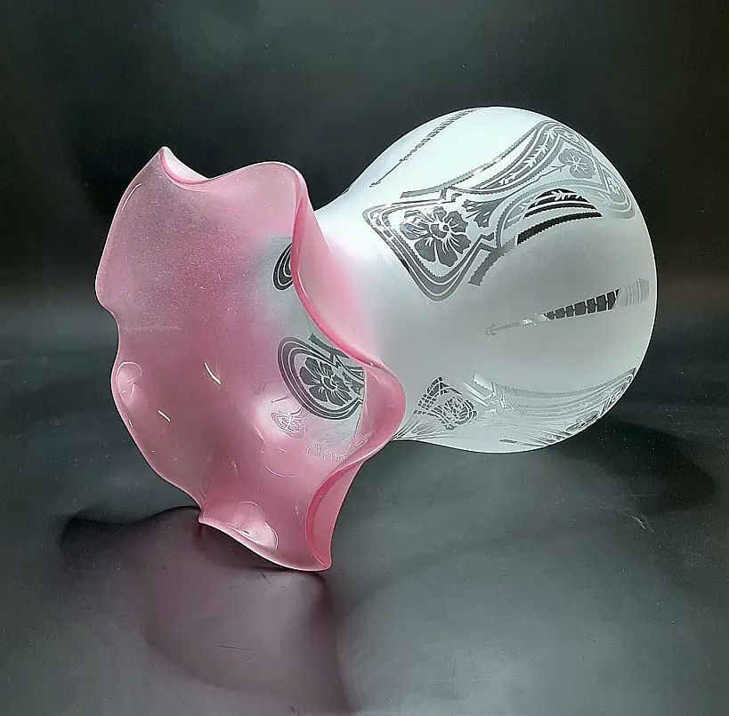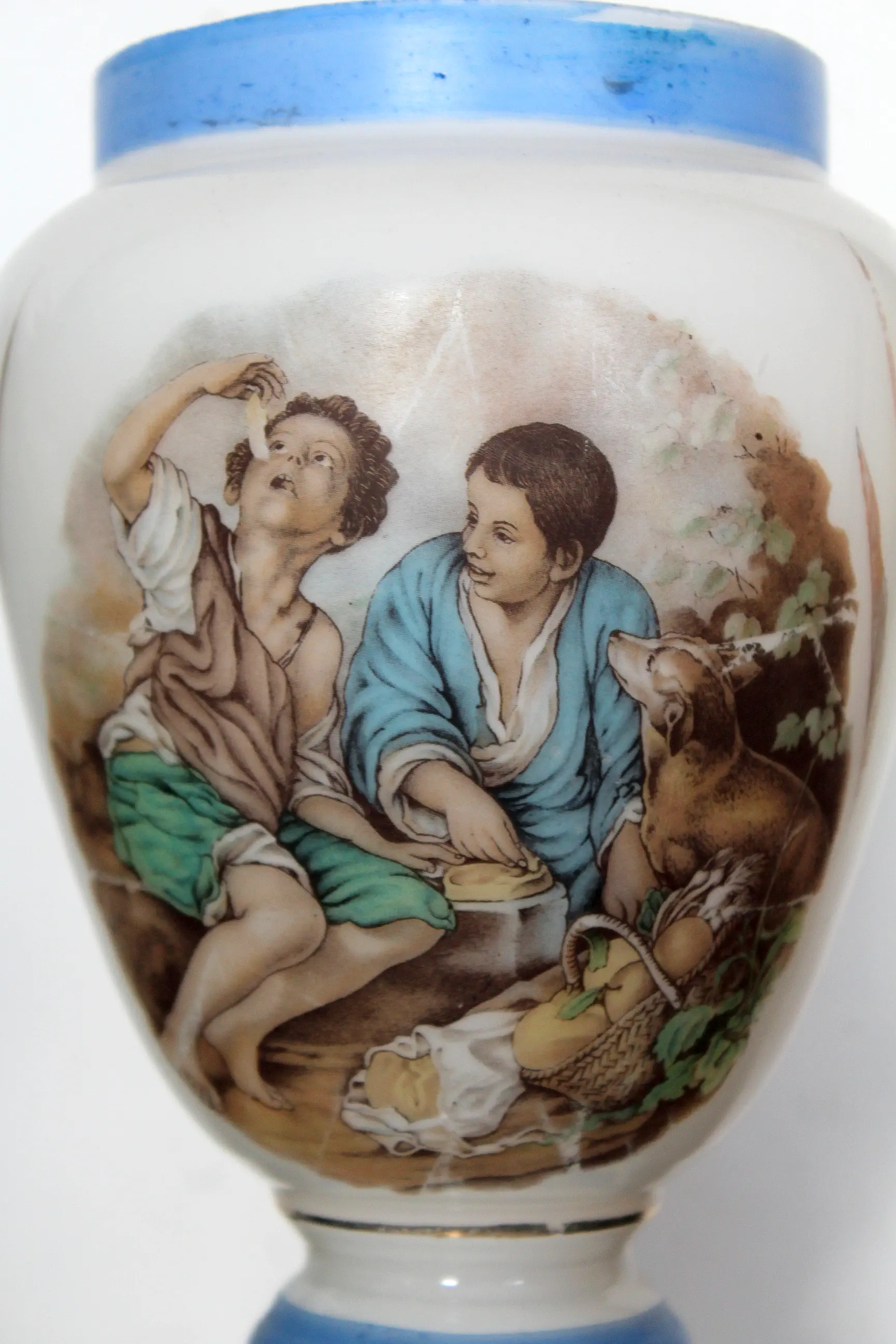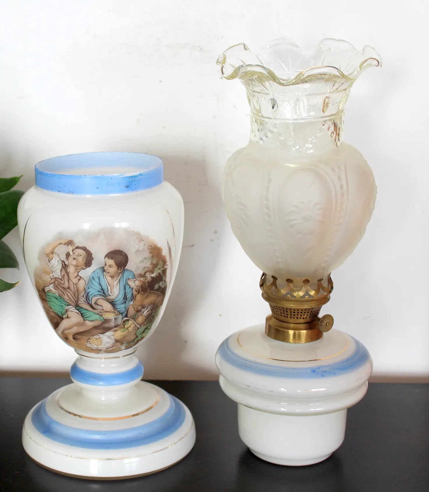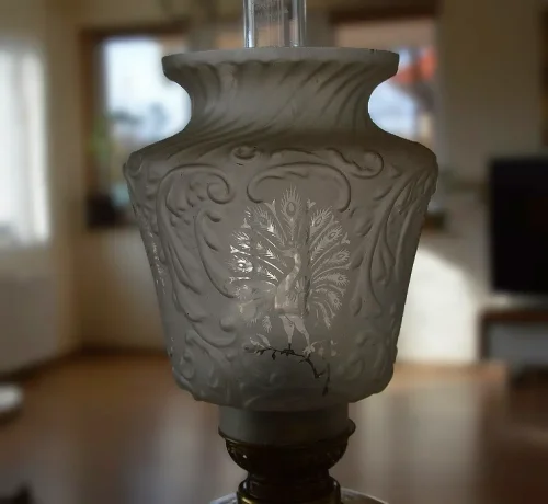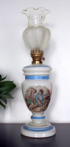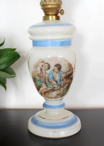 Francuska szklana lampa naftowa z sielskim obrazkiem.